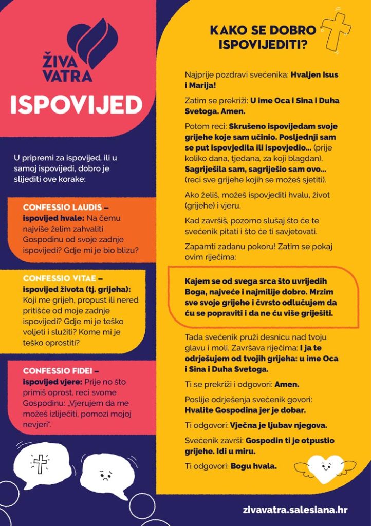 Kako se dobro pripremiti za ispovijed? Što sve treba reći u ispovjedaonici? Kako napraviti temeljit ispit savjesti? Sve su to pitanja koja zanimaju krizmanike i mlade, a često na njih nemaju odgovore.Tim programa Živa vatra, prvog cjelovitog programa pripreme za krizmu u Hrvatskoj, sažeo je najvažnije stvari o ispovijedi u ispit savjesti koji će pomoći svakoj mladoj osobi da spremnije pristupi ispovijedi.